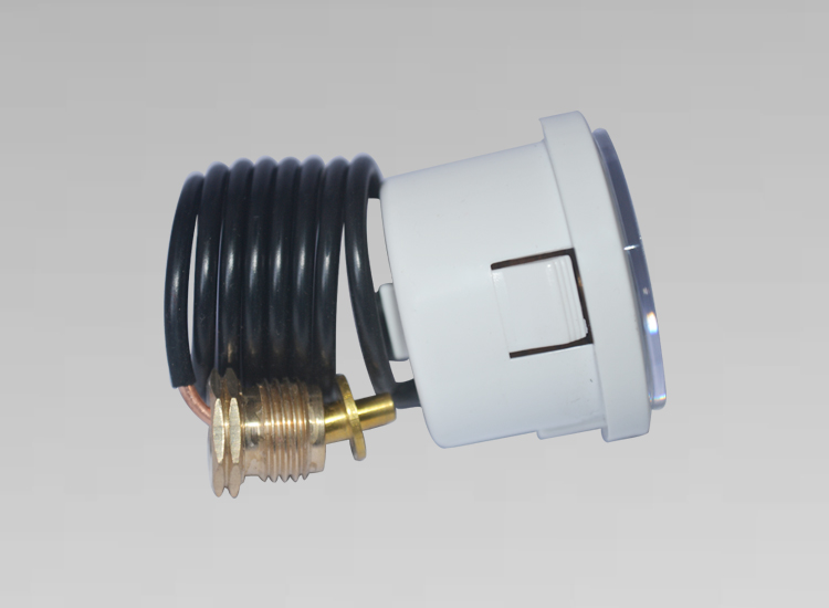 白色表盤,白色外殼,壓力0-6bar,0-0.6MPA,雙量程顯示,內徑37mm,*低壓0.5bar以下,高壓3BAR以上紅色線警告標識 精藝牌毛細管壓力表,主要應用于壁掛爐,電熨斗等水,汽方面的設備,也可稱為蒸汽壓力表,水壓表,壁掛爐壓力表,我廠目 前生產的毛細管壓力表主要參數為毛細管長度800mm左右,塑料外殼,黑色或白色PVC外套,銅頭接口常規為G1/4,也可定制M10*1, 以及其它接口。